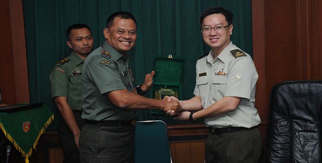 Jakarta (MI) : Panglima Kostrad Letjen TNI Gatot Nurmantyo didampingi Kaskostrad, Ir Kostrad, Koorsahli Pangkostrad serta para Asisten Kaskostrad menerima kunjungan kehormatan The Commander Combat Service Support Command (CSSCOM) Brigadier General Tan Peng Kuan dan rombongan, bertempat di ruang tamu Panglima Kostrad Jl. Medan Merdeka Timur No.3 Jakarta Pusat, Kamis(31/10/2013).